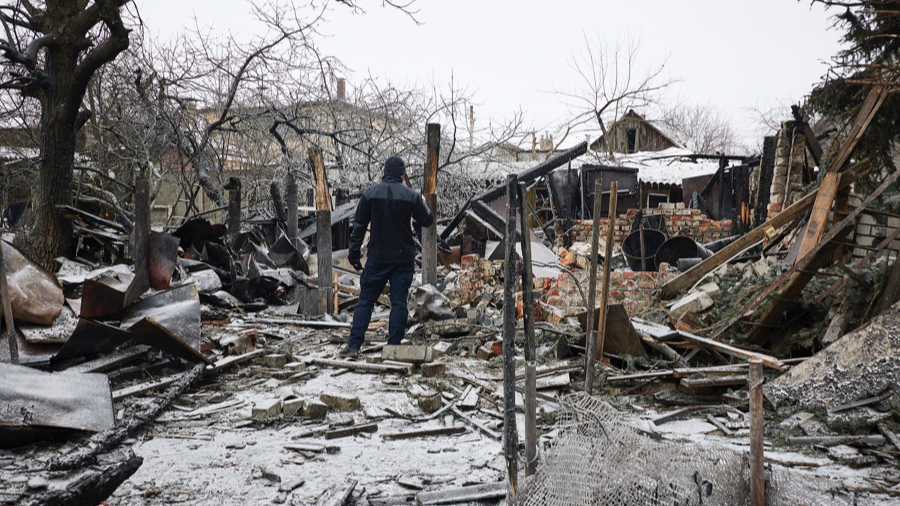 24日,乌克兰哈尔科夫,一名乌克兰救援人员在俄罗斯袭击哈尔科夫一处私人建筑的现场工作。 视觉中国