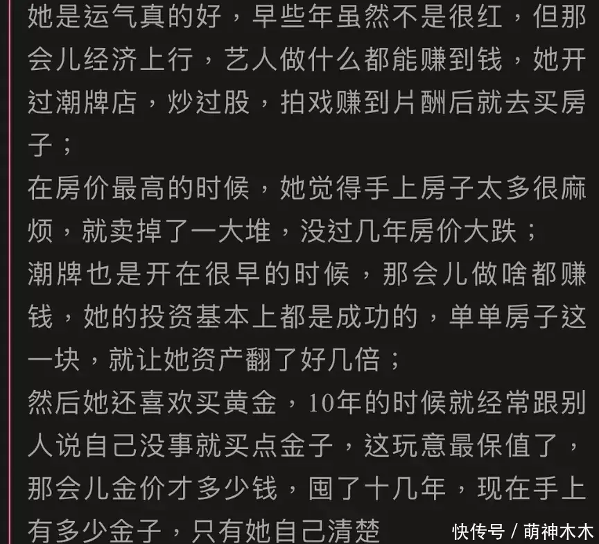爆料原文放在这里,按照爆料人的说法,吴昕能有十位数身家,全靠运气好,年轻的时候就红了,当时明星做什么都能赚钱,吴昕尝试了许多副业,开过店、炒过股、拍过戏,赚到钱就去买房子,又赶在房价最高点卖掉了,躲过了房价大跌。